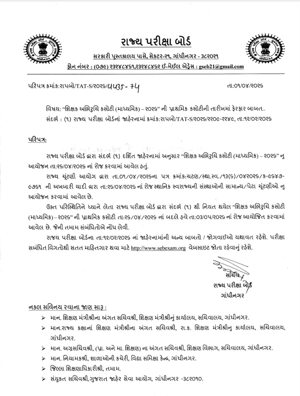 The State Examination Board (SEB), Gandhinagar, has officially announced a change in the examination date for the Teacher Aptitude Test (Secondary) 2026. This decision comes following the clash of the original exam date with the local body elections in Gujarat. Candidates who have applied for the TAT (S) 2026 must take note of the revised schedule to avoid any confusion.