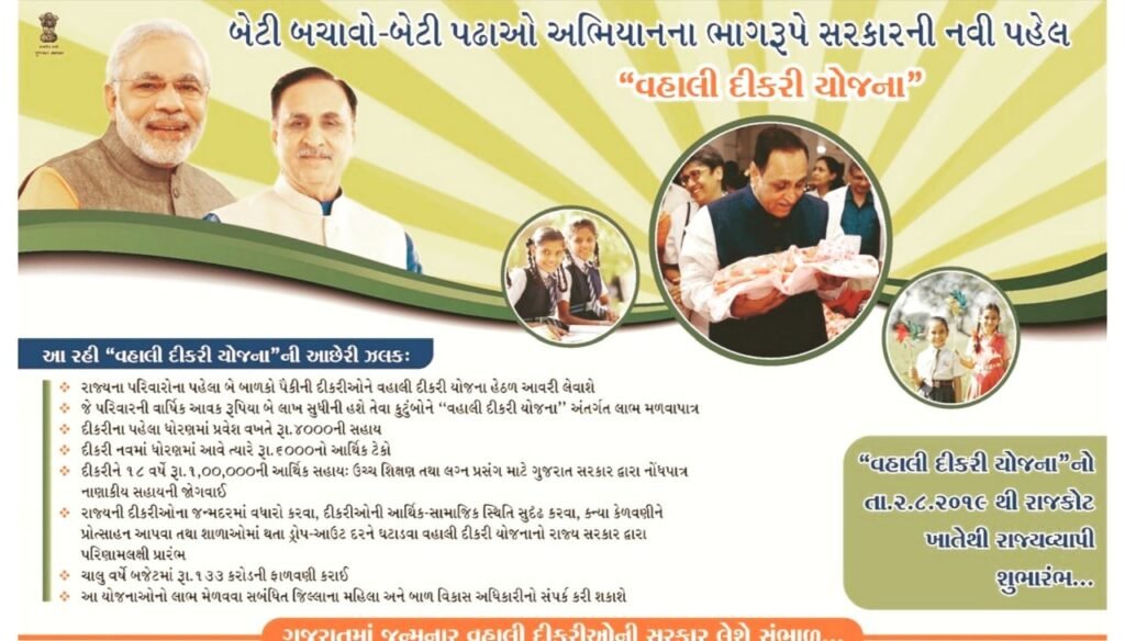 Vahli Dikri Yojana is a government scheme that provides financial assistance of up to Rs. 1,10,000 to eligible girls in Gujarat. This scheme works like a long-term scholarship plan, where the government supports the girl child at different stages of her life.